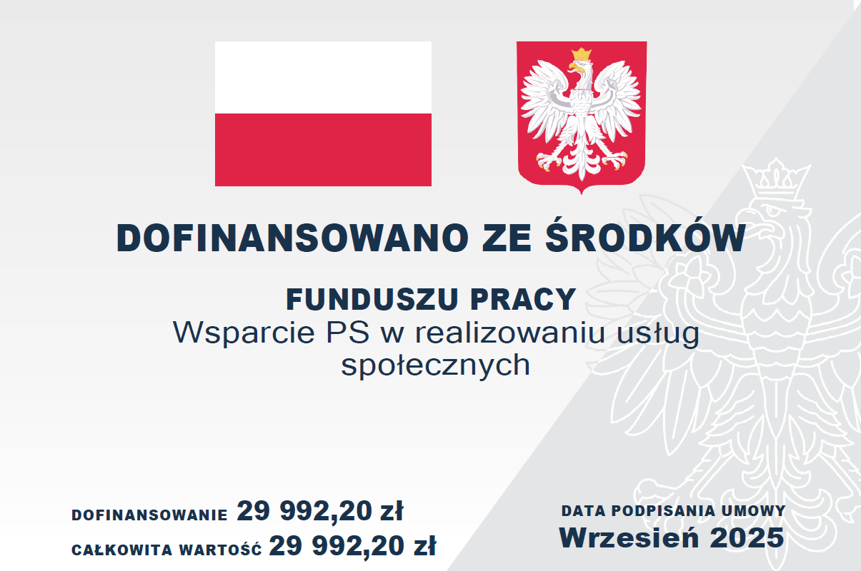 Dofinansowano ze środków Funduszu Pracy – „Wsparcie PS w realizowaniu usług społecznych”