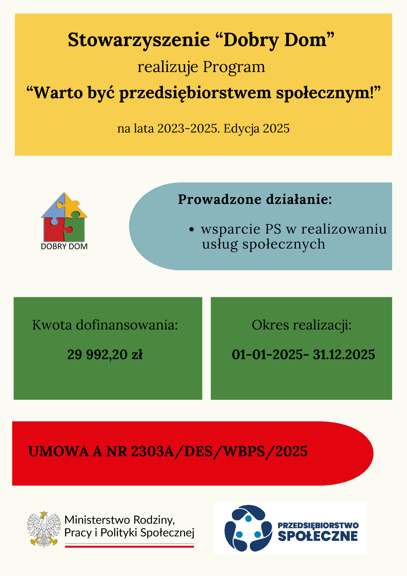 Stowarzyszenie DOBRY DOM realizuje program „Warto być przedsiębiorstwem społecznym”! na lata 2023-2025, edycja 2025.